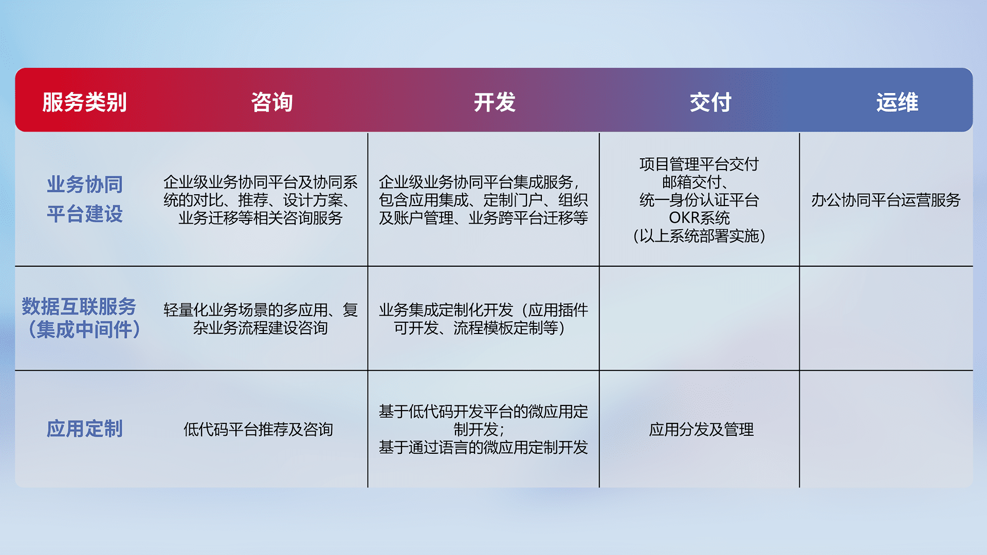 针对钉钉、、企微、、、、IDaas等平台级产品提供产品的规划、、、、方案、、、、交付、、定制化开发等服务,,,实现如统一协同办公、、、、智能客户服务、、、、混合会议管理、、智能数据查询、、、、等业务场景,,,,实现数字化转型。。。。